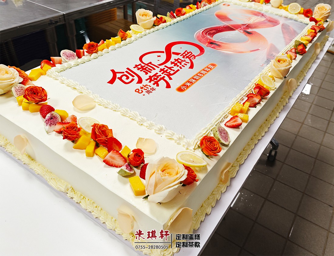 本次米琪轩定制的庆典蛋糕,不仅尺寸达 1.2 米(企业定制场景下的标志性规格),更融合了品牌与庆典双重元素:蛋糕表层以 “8” 周年数字为视觉核心,搭配 “创新奔赴热爱” 主题文案,边缘装饰新鲜水果与花艺造型,既契合小米科技感的品牌调性,又兼具烘焙美学质感。